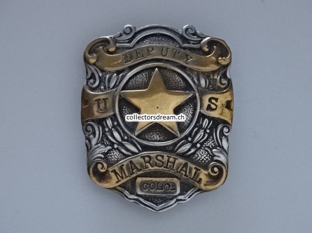 Metallabzeichen / Badge " Deputy U.S. Marshal Colo. " versilbert mit etwas Patina.
