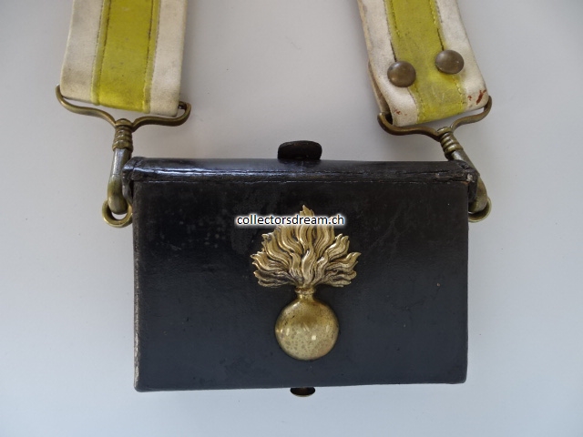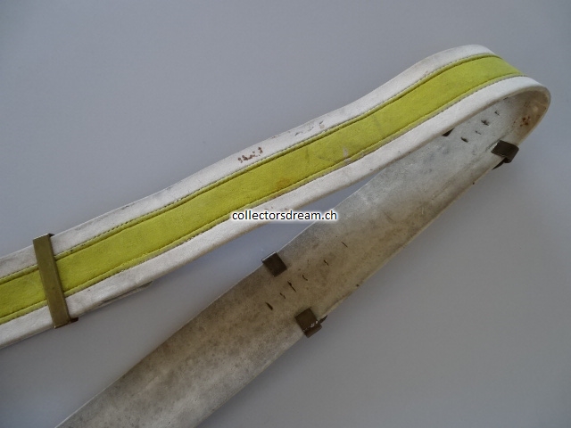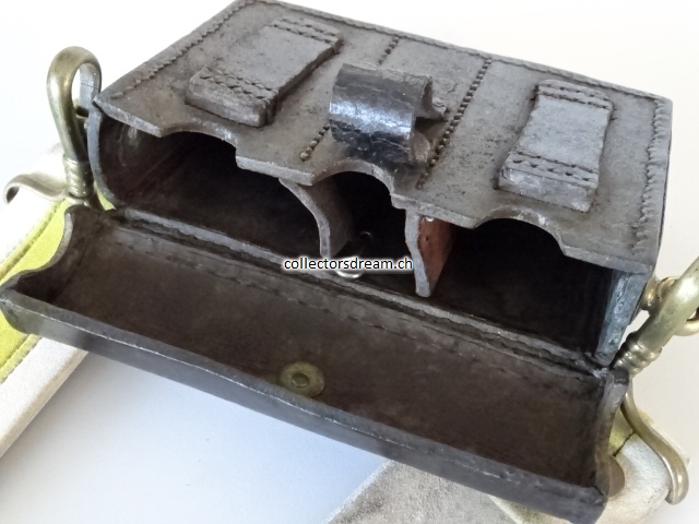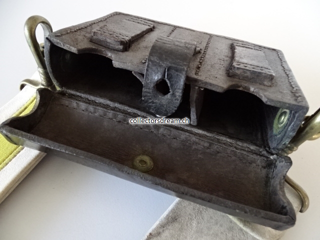 Leder mit Messingemblem, komplett mit Schulter Bandolier, ältere Fertigung, übliche Alters und Gebrauchsspuren, Bandolier etwas fleckig.