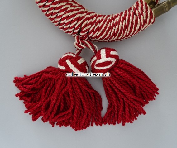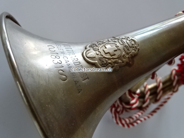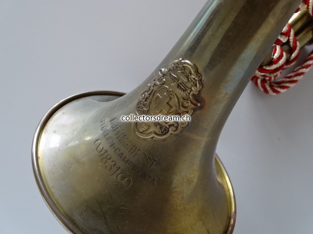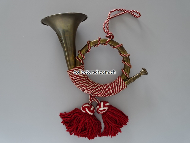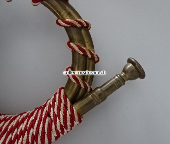 Gotthard Posthorn Model 1831 mit rot-weisser Kordel, genaues Alter unbekannt (ca. 50 bis 60 Jahre alt).